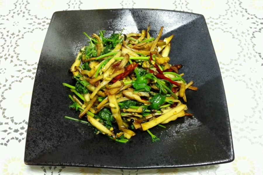 杏鲍菇、干红辣椒、盐、鸡精、胡椒粉、熟芝麻、葱姜丝