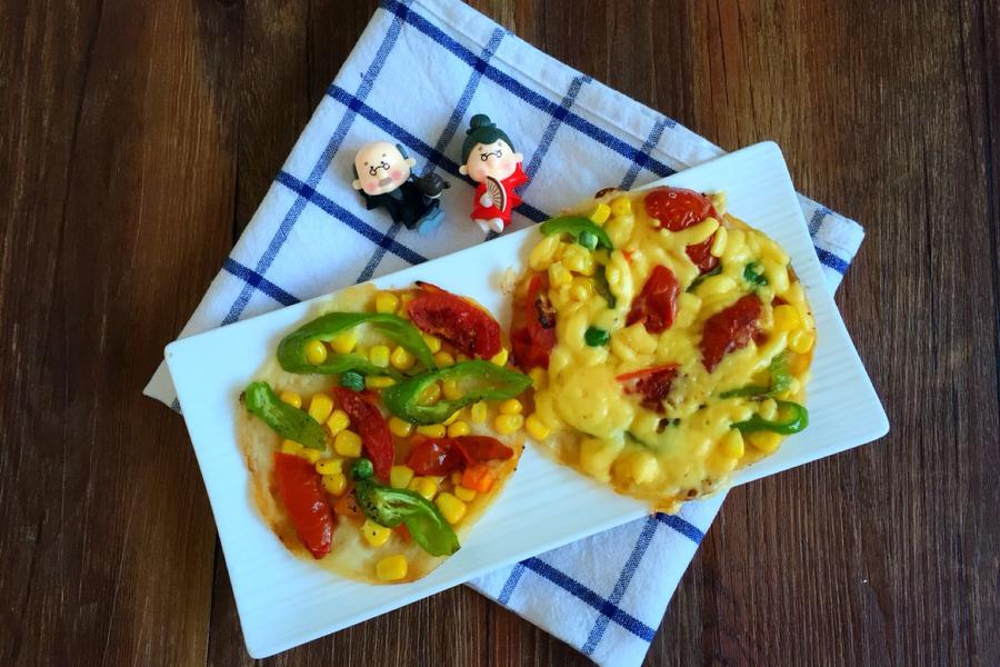 圣女果、面粉、水、什锦蔬菜丁、盐、糖、油、芝士、青椒,
