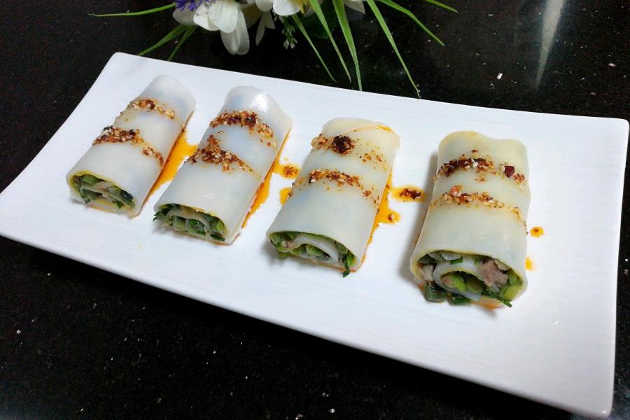 韭菜、豆角、水、姜末、肉、虾皮、粘米粉、盐、味精、8吋披萨盘