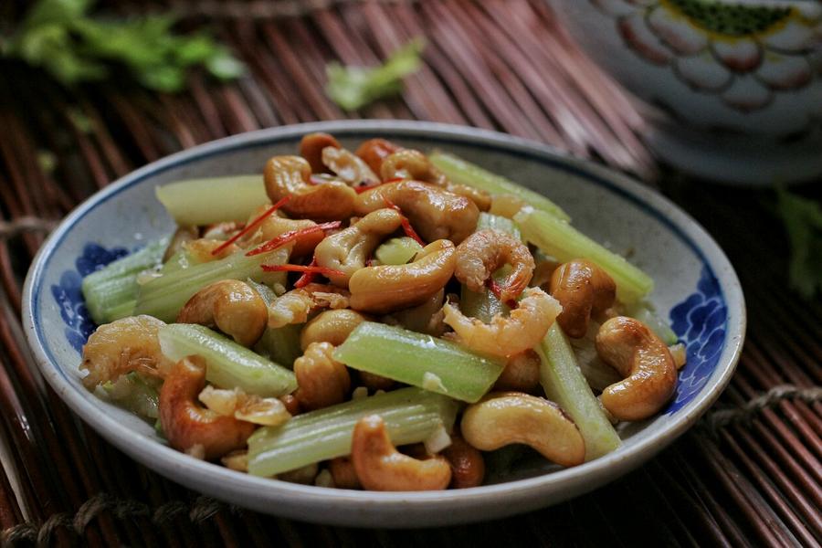 虾米、腰果、姜末、西芹、料酒、盐、油、鸡精、香油、蒜蓉