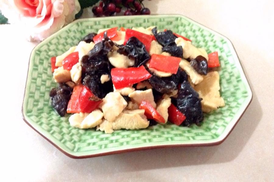 黑木耳、鸡胸肉、彩椒、料酒、盐、鸡精、生粉
