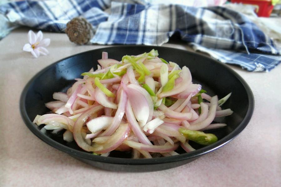 洋葱、青椒、醋、盐、白糖、五香粉、味极鲜、熟黑芝麻