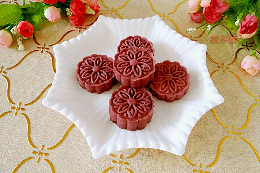 沸水、炒熟糯米粉、玉米油、白糖、炒熟澄粉、枣泥馅:大红枣、饼皮:紫薯粉、炒熟粘米粉