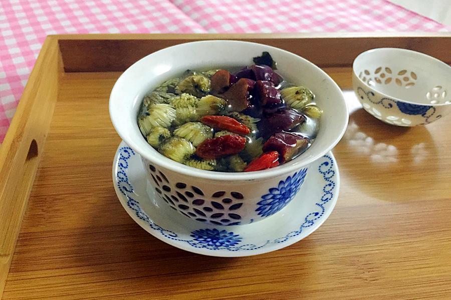 枸杞、开水、胎菊、红枣、冰糖