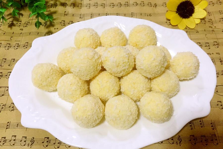 牛奶、低筋面粉、蛋黄、奶粉、黄油、椰蓉、糖粉、椰蓉(裹表面)