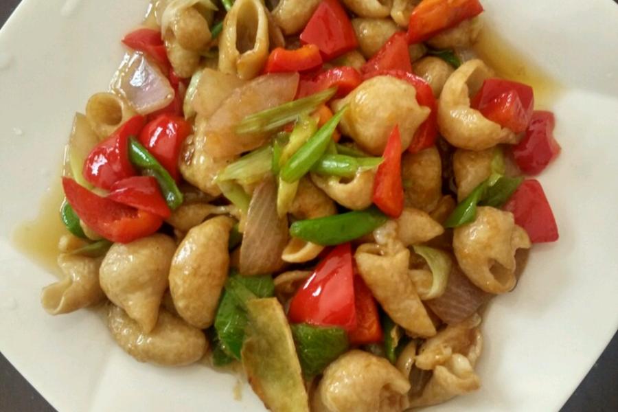尖椒、料酒、大蒜、生抽、鸡精、白糖、香油、淀粉、卤熟猪大肠