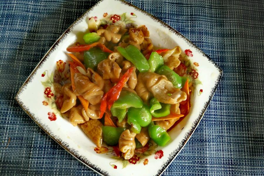 姜丝、红尖椒、肥肠、胡罗卜、绿菜椒、葱