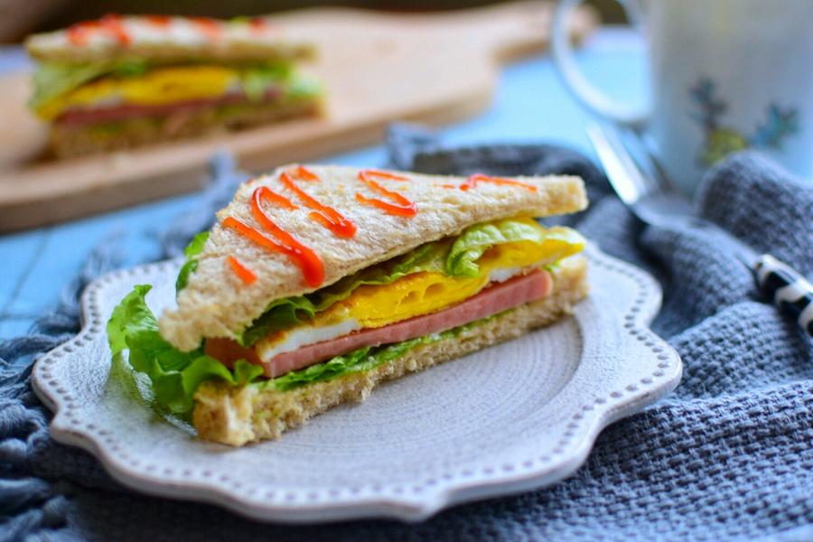 火腿、鸡蛋、吐司、西红柿 生菜叶