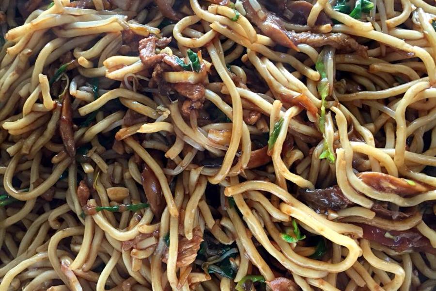 绿豆芽、蘑菇、面条、青菜、肉丝、葱姜蒜、老抽