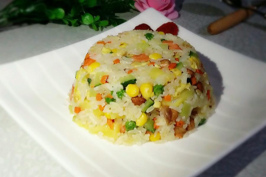 鸡蛋、胡萝卜、黄瓜、菠萝、青豆、火腿肠、剩米饭、玉米粒、熟花生米