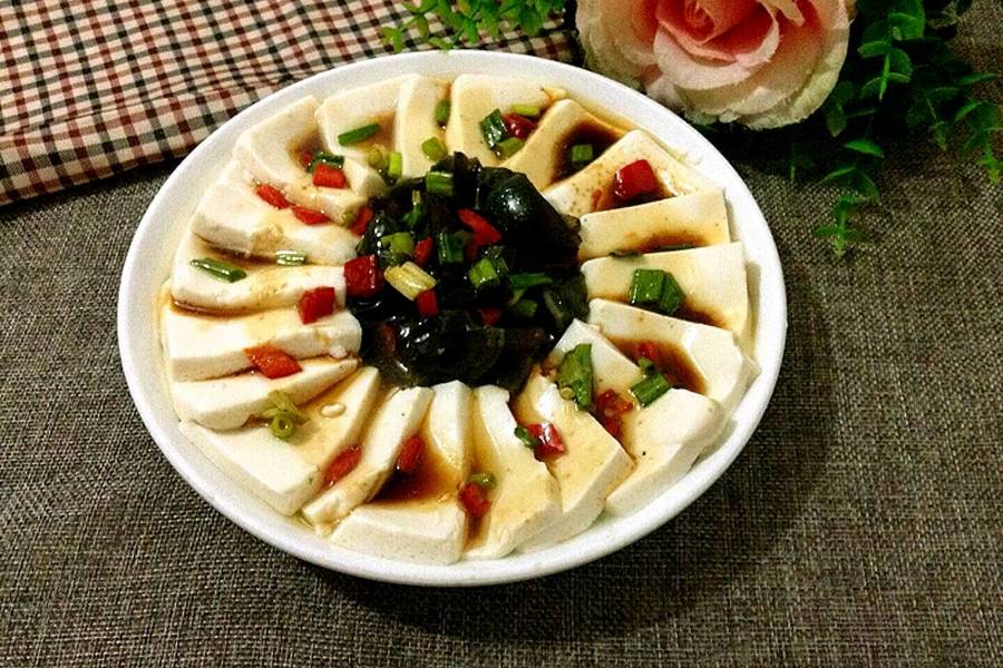 皮蛋、红椒、内脂豆腐、葱、生抽、白糖、香油