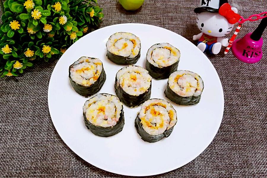 鸡蛋、紫菜、黄瓜、米饭、火腿肠、肉松、熟白芝麻、竹帘子、芝麻油、寿司醋
