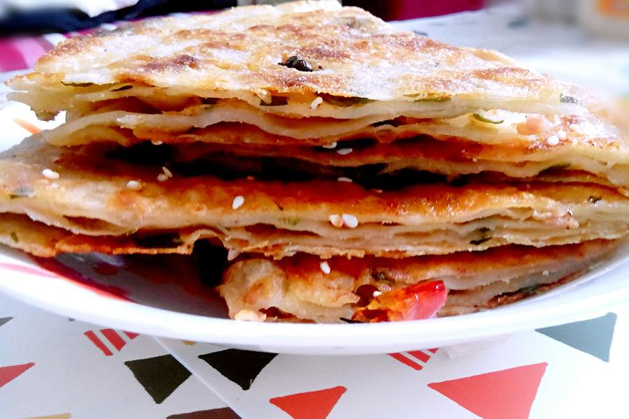 葱花、中筋面粉、熟白芝麻、熟芝麻粉、八角、食用油、食用油、白糖、清水、清水、花椒粉、孜然粉、花椒粒、李锦记蒜蓉辣椒酱、【表面装饰】、李锦记黄豆酱、【饼皮部分】、【酱料部分】、自制郫县豆瓣酱、炒好的酱料