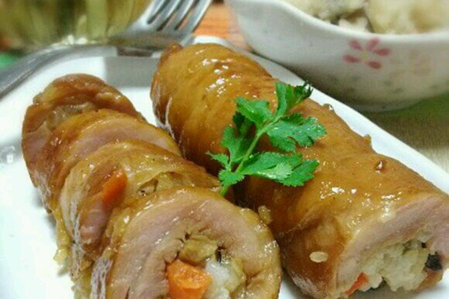 火腿、胡萝卜、榨菜、糯米、大鸡腿、葱、蒜、干香菇、蚝油、白砂糖、生抽、油盐、烧烤酱