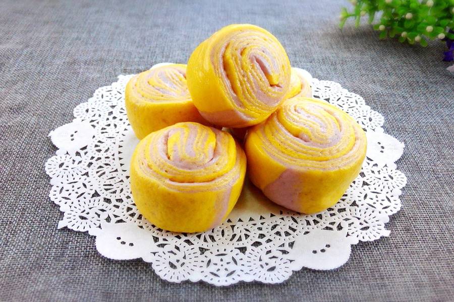 面粉、温水、菠菜汁、酵母粉、白糖、紫薯泥