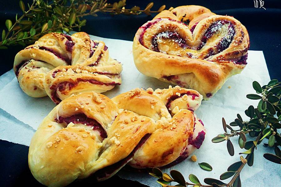 鸡蛋、牛奶、酵母、高筋面粉、去皮芝麻、盐、橄榄油、紫薯泥(馅料)
