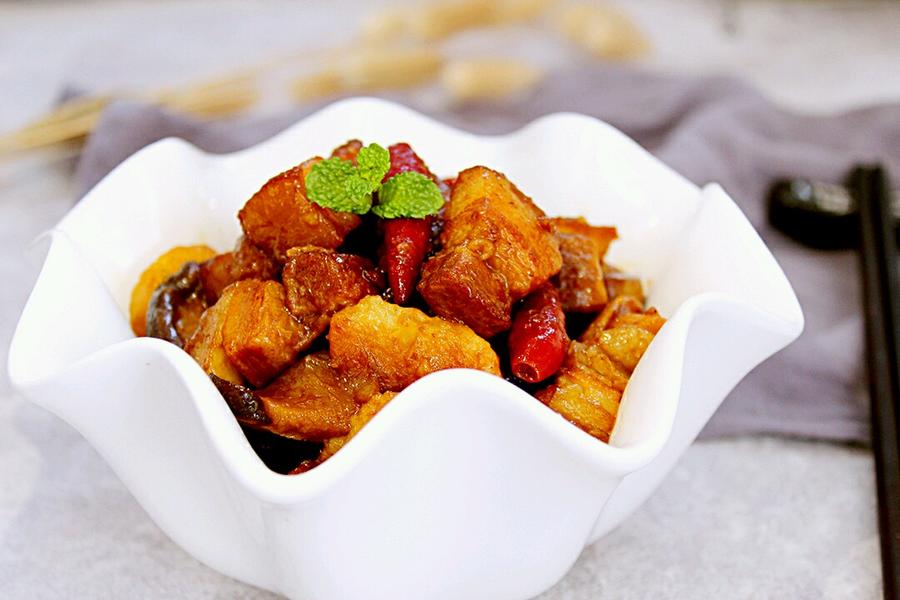五花肉、山药、红干椒、泡发香菇、冰糖、姜、大葱、料酒、盐、八角、桂皮、食用油、生抽、鸡精、老抽、清水、香叶
