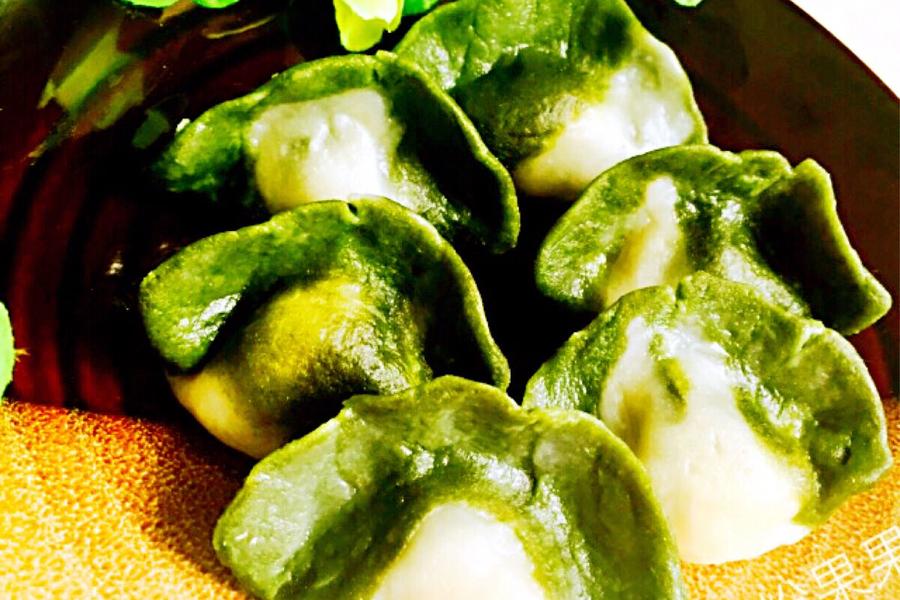 荠菜、面粉、肉馅、炸好的菠菜汁