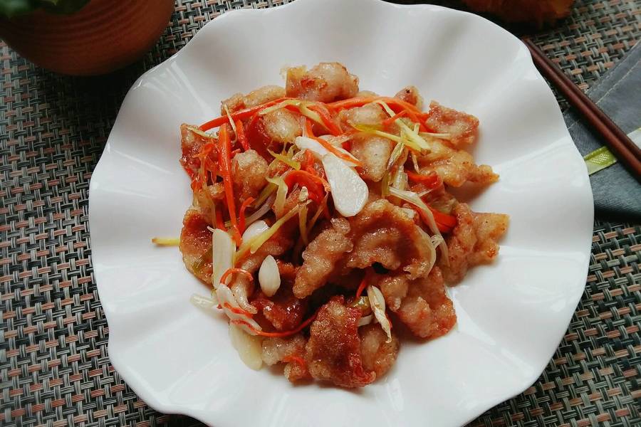 胡萝卜、玉米淀粉、猪外脊、葱、姜、料酒、盐、食用油、白糖、清水、白醋