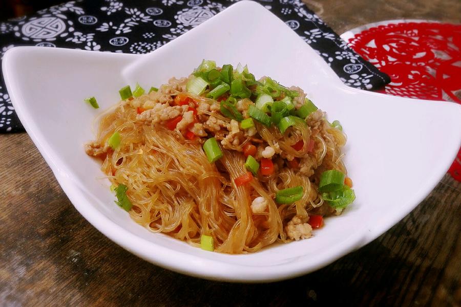 青椒、粉丝、猪肉末、红辣椒、葱姜蒜、料酒、生抽、鸡精、白糖、郫县豆瓣酱