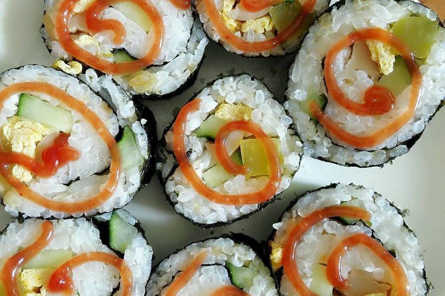 鸡蛋、胡萝卜、黄瓜、火腿肠、海苔片、酸萝卜条、新米饭