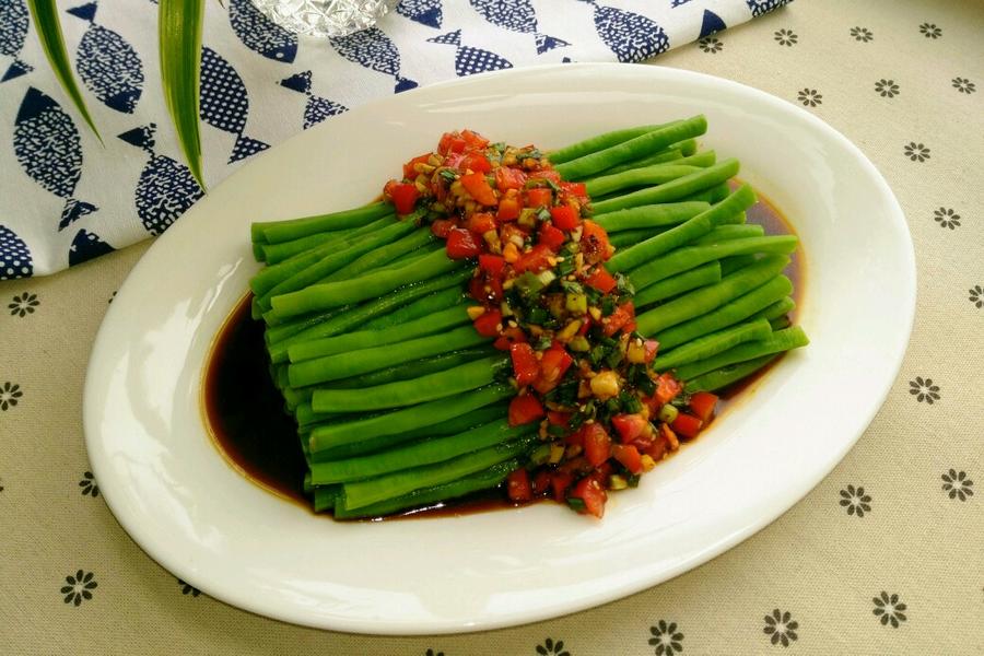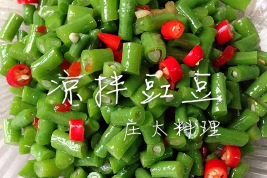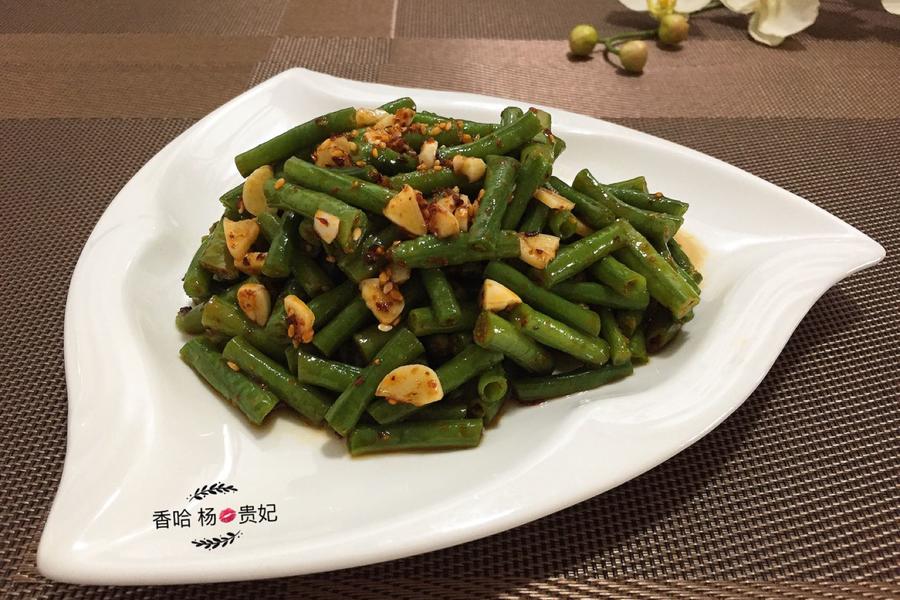 豇豆、蒜、盐、生抽、鸡精、白糖、香油、辣椒油、老醋