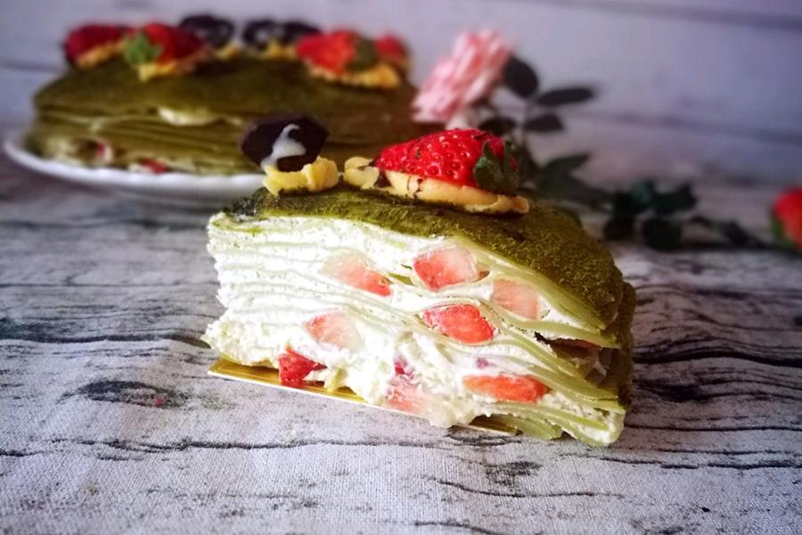 鸡蛋、牛奶、低筋面粉、新鲜草莓、黄油、抹茶粉、淡奶油