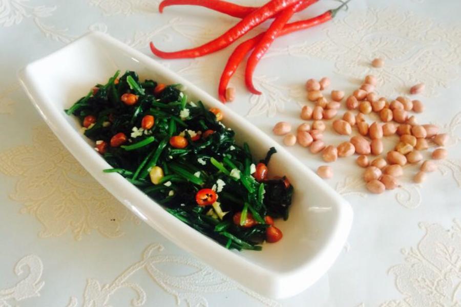 菠菜、花生米、盐、鸡精、花生油、辣椒油、蒜末、老陈醋