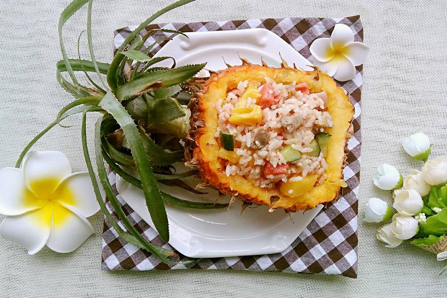 鸡蛋、洋葱、菠萝、腰果、米饭、玉米粒、鲜虾、肉松、红菜椒、豌豆粒