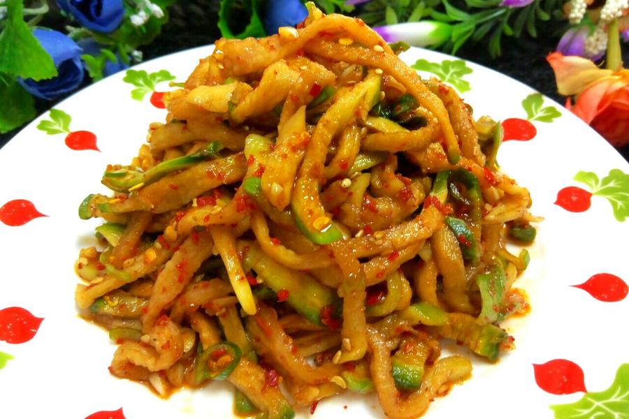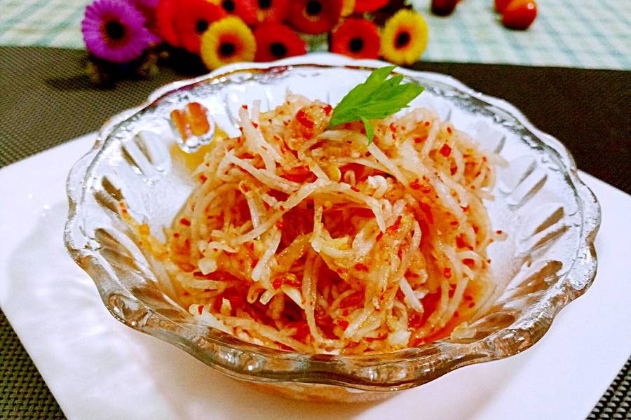 青萝卜、盐、白糖、香油、味精、陈醋、辣椒油、味达美、黄豆酱油