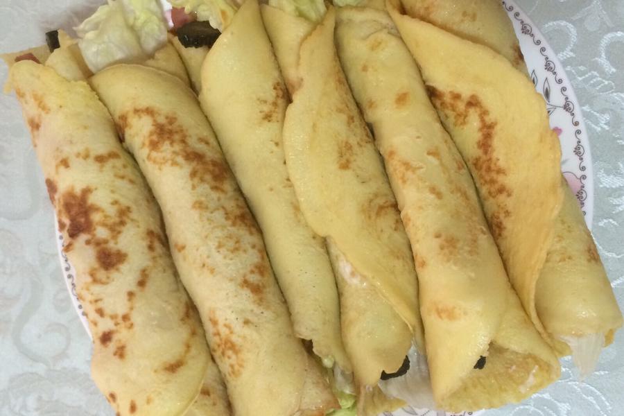 火腿、鸡蛋、生菜、青豆粒、玉米粒、芝士片、卷饼皮