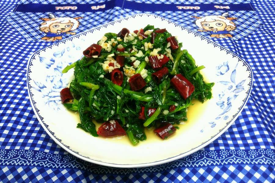 蒜瓣、茼蒿菜、盐,味精、植物油、干辣椒段