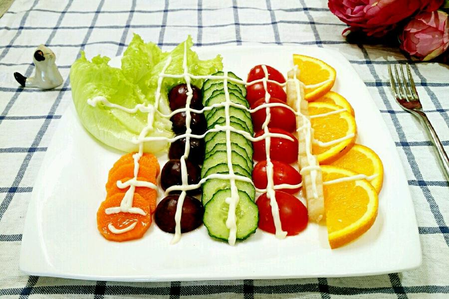 玉米粒、紫甘蓝、秋葵、苦苣、樱桃番茄、丘比沙拉酱、小乳瓜