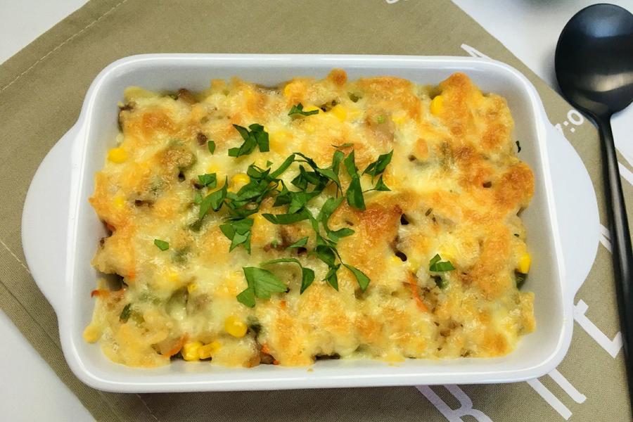 芹菜、洋葱、胡萝卜、玉米、肉末、米饭、四季豆、马苏里拉芝士