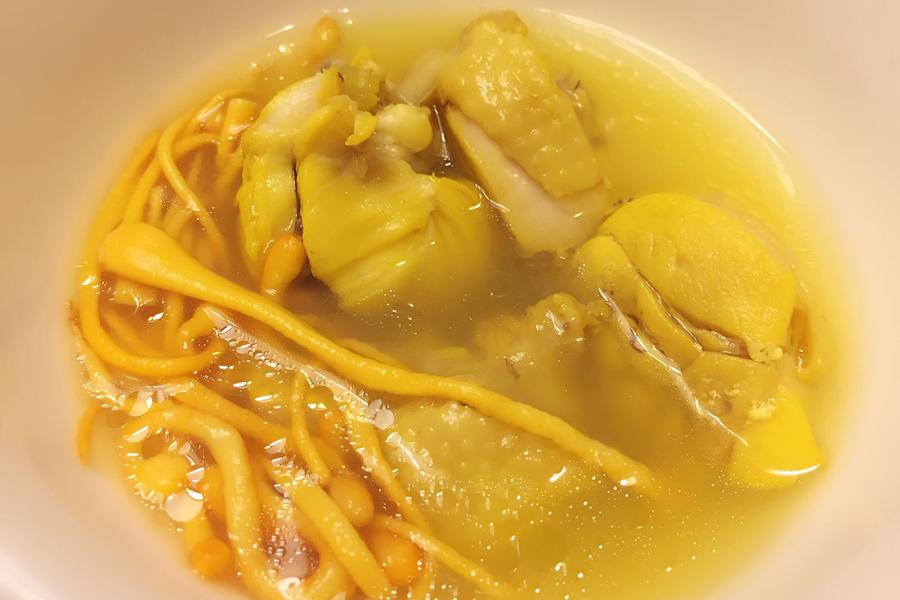 鸡腿、豆苗、蒜片、鸡汁、虫草花、料酒、盐、姜片、葱段