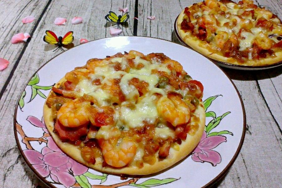 洋葱、玉米粒、火腿粒、青椒圈、红萝卜粒、红椒圈、虾仁、披萨饼
