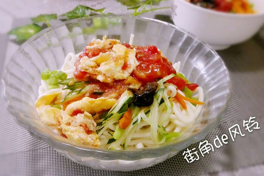 鸡蛋、胡萝卜、西红柿、黄瓜、黑木耳、面条、长豆角、葱蒜、盐、生抽、鸡精、白糖
