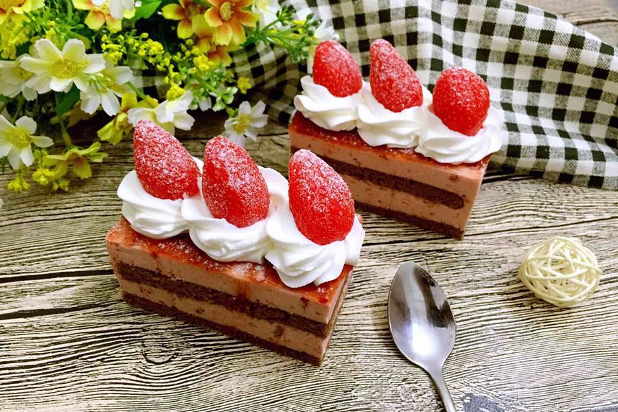 草莓、牛奶、蛋黄、覆盆子果泥、吉利丁、糖、打发奶油、防潮糖粉、巧克力蛋糕胚