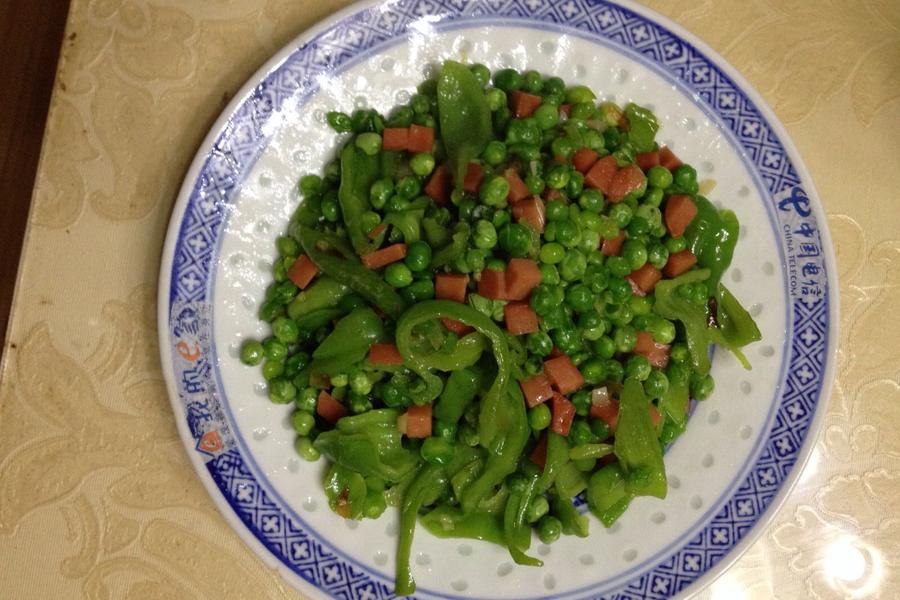 豌豆、火腿肠、凉薯、盐、食用油、生抽、香油、味精、水淀粉