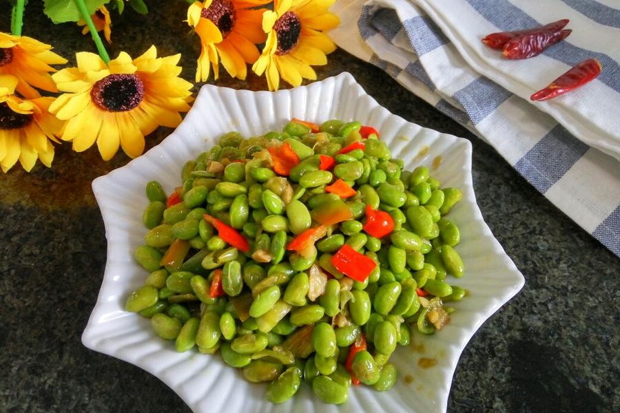 青椒、葱花、姜丝、红椒、青豆芽、盐、味精、香醋、大豆油