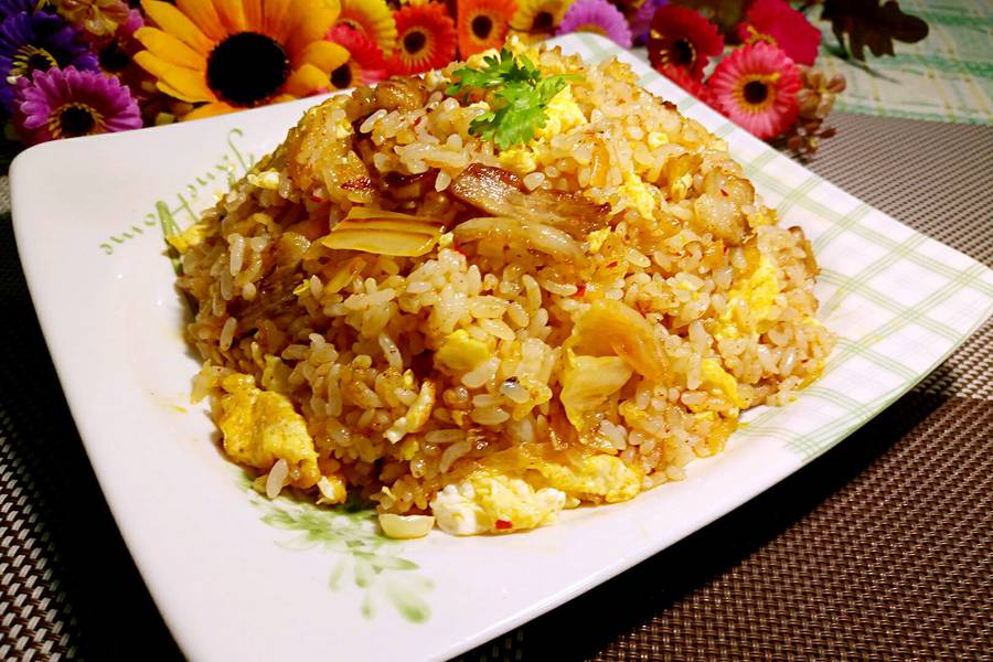 鸡蛋、米饭、辣白菜、五花肉片、盐、花椒粉、鸡粉