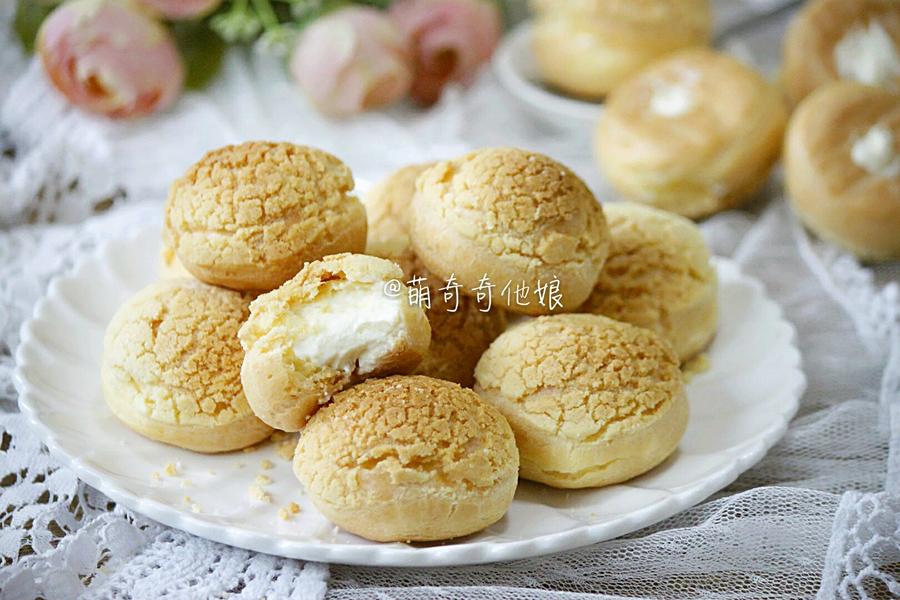 淡奶油、牛奶(泡芙)、黄油(泡芙)、低筋面粉(泡芙)、低筋面粉(酥皮用)、黄油(酥皮用)、糖粉(酥皮用)、鸡蛋液(泡芙)