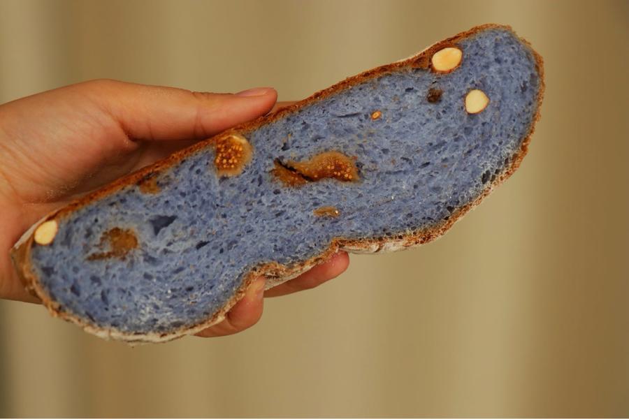 杏仁、高筋面粉、开水、核桃仁、全麦面粉、细砂糖、杏干、开心果、黄油、葡萄干、盐、酵母粉、蝶豆花、糯米粉(麻薯馅)、玉米淀粉(麻薯馅)、牛奶(麻薯馅)、细砂糖(麻薯馅)、黄油(麻薯馅)