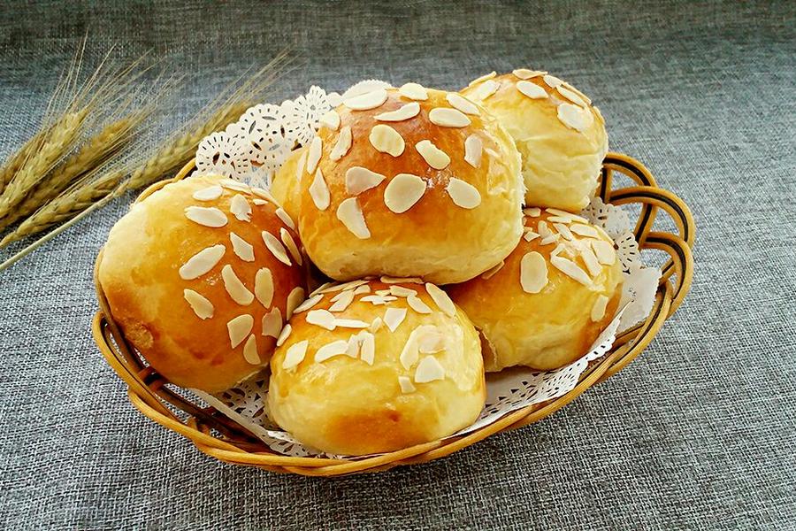 鸡蛋、酸奶、酵母、高筋面粉、奶粉、黄油、盐、糖、淡奶油、蛋液(刷表面)、扁桃仁片(装饰表面)