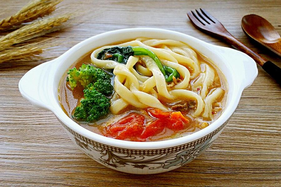 菠菜、葱花、瘦肉、小番茄、手擀面、西蓝花、料酒、盐、生抽、油、鸡精、清水