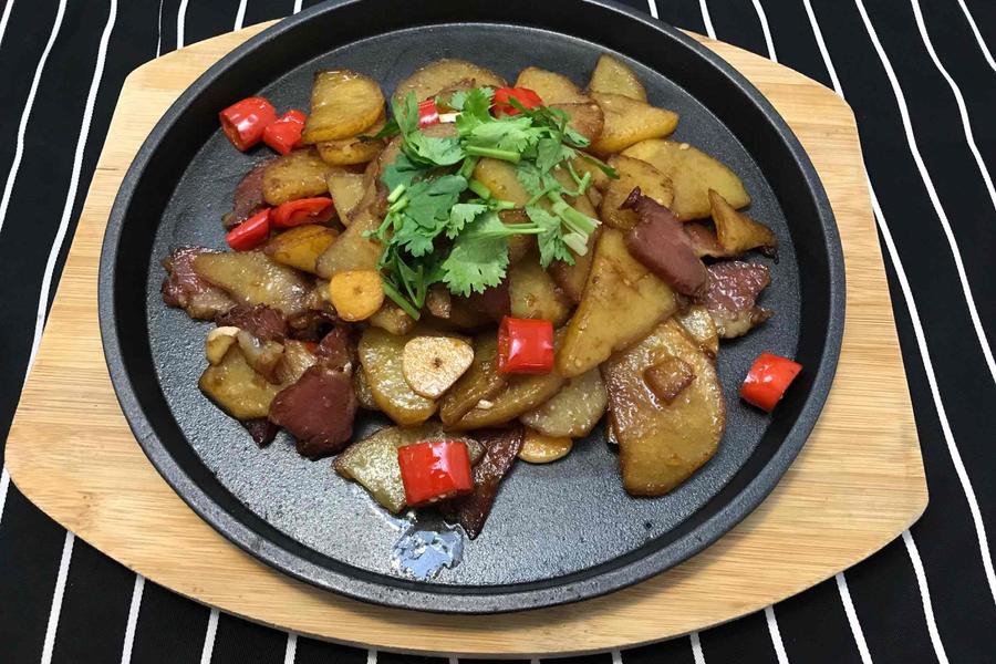 土豆、香葱、盐、白糖、花椒粉、辣椒粉、孜然粉、香醋、鸡精或味精