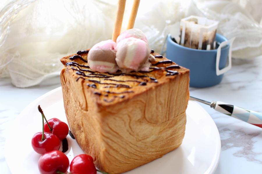 樱桃、黄油、冰淇淋、蜂蜜、巧克力酱、金砖面包