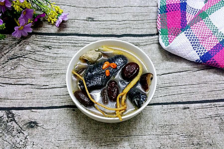 乌鸡、香菇、莲子、干百合、红枣、枸杞子