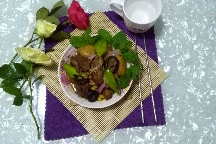 土豆、大米、鲜香菇、盐、糖、食用油、生抽、香油、腊肠