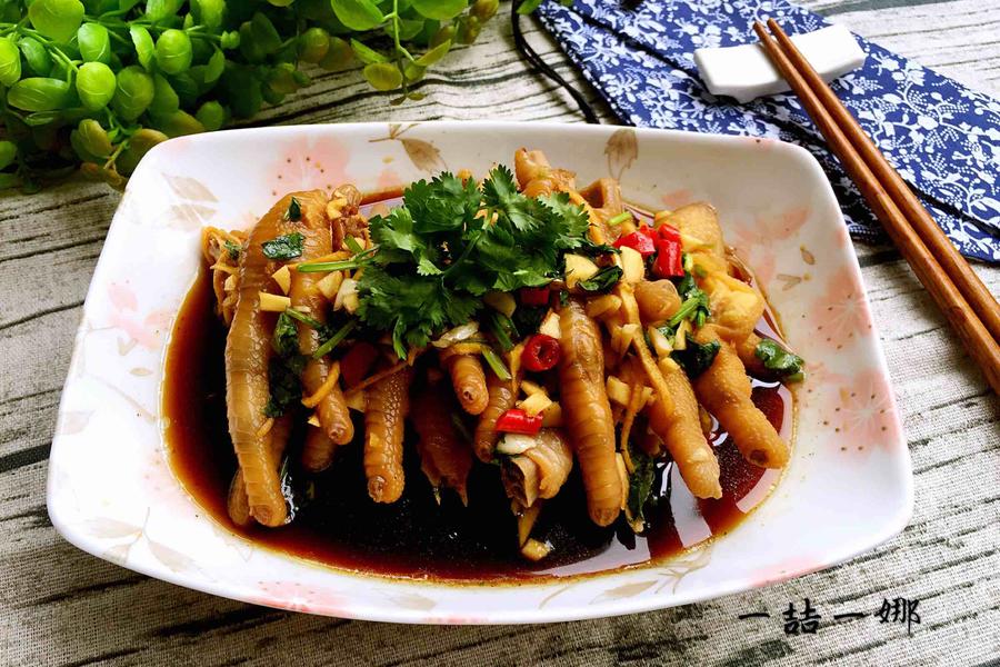 鸡爪、香菜、小米辣、姜、醋、蒜、料酒、糖、生抽、香油